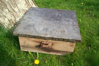This bee hive was found in an old barn. It is 16" x 16" x 8" high. The 11 frames are approx 5 1/4" high x 14" long, which is an unusual size. The hive cap is wood, covered by galvanized metal. The hive body has 2 wood sides, and 2 galvanized metal sides, with iron handles. The bottom is made of galvanized metal with a big round hole in it. (Please refer to the pictures) I have never seen a bee hive like this one! If anyone has information regarding this type of hive, I would like to hear from you.