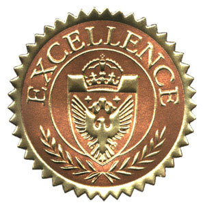 Our official Excellence foil seals are great for certificates, awards, or any document that needs extra recognition. The convenient peel & stick feature makes them easy to apply to virtually any paper document. These Excellence seals come in a very visible size of 1 3/4-inches in diameter. They are already embossed to give your document an even more eye-catching effect! This 4 pack comes in gold. Complete the look and order your official Excellence foil seals today!