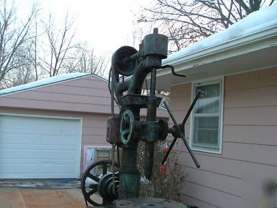 This an old drill press I was going to refinish but now I just don't have the time or space. It does work, and everything seems to still be tight. I have not used it for a while (a year or so) it has just been move from conor to conor now it is in my garage. The lower power unit is not in the right spot, I was told it was suspose to go over head. It was like that when I got it.