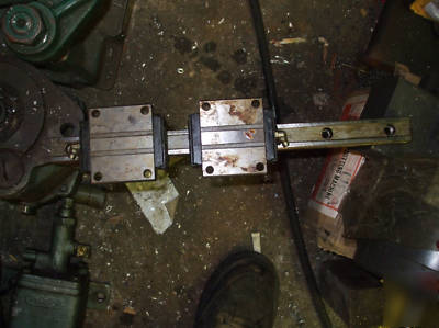 used rail in good shape from mfg equip. has 2 trucks on a rail about 13 inch long. the rail is about 1 inch square. it has double ball roller tracks. carriages have not been removed from rail and safty wired on to prevent loss of bearings if these are that style.
