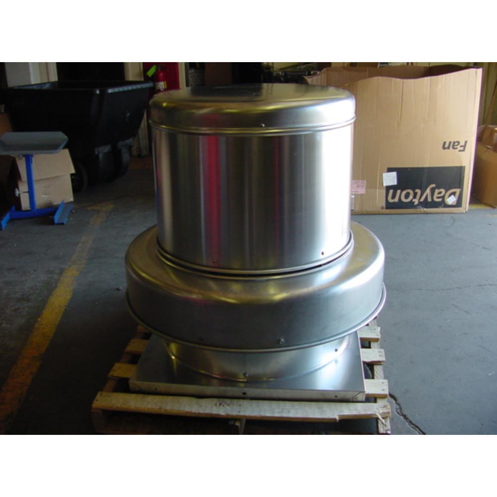 EXHAUST VENTILATOR, CENTRIFUGAL DOWNBLAST, LESS DRIVE PACKAGE, ROOF MOUNTING LOCATION, MAXIMUM INLET TEMPERATURE: 180 FAHRENHEIT, HP RANGE: 1/4 TO 3, WHEEL DIAMETER: 24 1/2", RPM RANGE: 460 TO 910, WHEEL MATERIAL: ALUMINUM, HOUSING MATERIAL: SPUN ALUMINUM, GENERAL CLEAN AIR APPLICATION, INCLUDES NEMA 1 JUNCTION BOX, DIMS: BASE W 34" X BASE L 34" X OVERALL H 40 1/8", WEIGHT: 122 LB. *MAY HAVE SLIGHT DAMAGE TO BASE*.