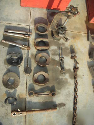 I have an A-2 Drilling and Tapping machine made by Mueller for sale. This equipment is used to insert or extract corporation stops from 1" to 2" and pipe plugs to 2-1/2" in size. This machine set comes with assorted saddles for different size pipe. The A-2 machine is in the bigger box in the pictures, and the other 4 smaller boxes have smaller tapping equipment. I do not know the model of these but they are also Mueller. All pieces come in wooden storage boxes with latches and handles. These are hardly used pieces of machinery, each drill bit looks like they have never been used. The A-2 machine itself has a solid brass housing, and gate valve. The other machines are C-1 and G machines, they are also included.