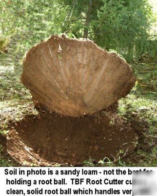 The TBF Root Cutter is a superbly effective hand tool which, used in conjunction with a spade, allows you to cut and shape root balls from 16 to 48 or more in diameter in preparation for transplanting. The Root Cutter is essential if you transplant even small trees or shrubs (anything with a trunk diameter of about 1 or more). Constructed for long life with high strength steel shaft and replaceable blade, we sincerely believe that the TBF Root Cutter is a basic horticultural necessity which belongs in nearly every gardener s tool collection. You may purchase theTBF Root Cutter separately. Click on View seller s other items , or search for tbf root cutter.