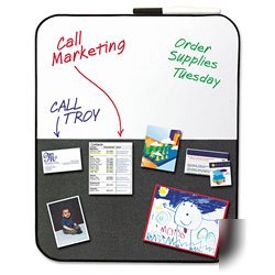 Make the most of small spaces like cubicles and home offices with this handy combination board. It offers two surfaces: a long-lasting charcoal gray adhesive surface on one half where you can display, reposition and remove documents without pins, tacks or tape and a white dry erase board on the other half, where you can jot notes and erase them easily. Black plastic frame. Package includes black dry-erase marker and mounting hardware.