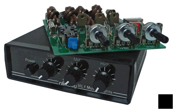 See music come alive! Three different lights flicker in time to music, one light each for low, mid and high frequencies. Each is individually adjustable, runs on 120 VAC and controls up to 300 watts per channel - enough to drive spotlights, Christmas lights, mood lights, strip lights, and more! Speaking of mood light, this will really crank up your next party! So create your light show just like the rock concerts and Vegas shows in your own home. Includes the matching case and knob set shown to give your music lights kit a great finished look. The case size 5"W x 11/2"H x 51/4"D.