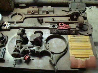 SEAT BRACKET ' EF 216 ', EXHAUST ELBOW ' EF 182 ', 2 AXLE CAPS, 5 HAND HOLE PLATES, 1 AXLE SPRING MOUNT ' 420 ', 2 AXLE PLATES, 5 BOILER CARRIAGE SUPPORT BARS, 11 CAST IRON WHEEL WASHERS, 1 CAP ' 6412 ', 1 ROUND BAR WITH SQUARE END.