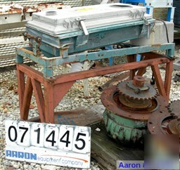USED: Rotex screener, stainless steel. 20" wide x 48" long 2 deck, 3 separation (requires screens). Clamp down aluminum top cover, (3) bottom outlets. Driven by a 1/2 hp, 3/60/208-230/460 volt, 1140 rpm XP motor. Includes gearbox. Unit mounted on a 31" high carbon steel frame.