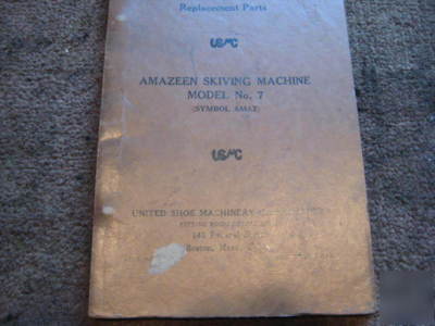 THIS IS AN ORIGINAL PARTS BOOK FOR THE UNITED SHOE MACHINERY CORPARATION FOR A AMAZEEN SKIVING MACHINE MODEL "7" ALSO KNOWN AS AMAZ IT IS DATED APRIL. IT IS 73 PAGES. IT IS IN GREAT CONDITION AND HAS NEVER BEEN WET. I HAVE HUNDREDS OF OTHER BOOKS THAT I WILL BE LISTING BUT PLEASE DON'T ASK ME TO LOOK AS THEY ARE ALL STORED IN BOXES AND I WILL GET TO THEM AS I CAM. THIS IS A NO RETURN ITEM.