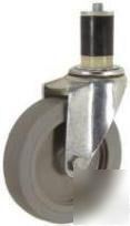 Expandable Rubber Applicators: This caster is designed for use in food service equipment with legs made of hollow tubing. The stem of the caster is threaded with a plastic spacer, a round rubber applicator and a knurled nut at the top. The rubber applicator fits snugly up into the leg. When the fork of the caster is twisted by hand, it tightens the knurled nut on the other end, squeezing and thus causing the rubber applicator to expand against the inside of the tubing. This locks the caster in place inside the tubing. In order to purchase the right size, you will need to accurately measure the inside diameter (ID) of the leg or tubing into which the caster is to be installed.