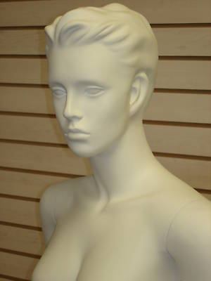 This beautiful female mannequin is made of fiberglass, a special form of plastic that features light weight and durable use. White color with molded hair makes it excellent for displaying. It comes with one round metal base and two support rods which can hold the mannequin either from foot or calf. With detachable arms, hands, leg and upper body, it is easy to set up and dress.