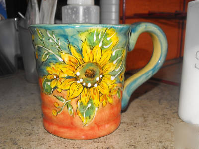 19. Large majolica mug with ornage, blue and yellow sunflower painted design. 16 -18 ounces.