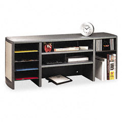 Durable steel space saver holds binders, folders office supplies and more. Even includes pencil cup and CD storage. Steel shelves and plastic dividers are adjustable. End panels pop out and can be easily covered with fabric (not included) to match your office space! 12 1/2" deep shelves. 18 1/2" high. Desktop Sorting Rack/Space Saver Type: Hutch-Style Space Saver; Color(s): Graphite; Platinum; Material(s): Steel; Width: 47 in.