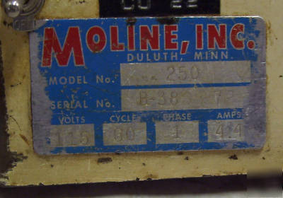 Description: Moline Inc #250 Automatic Bagel Cutting Machine. A fully automatic countertop unit, just drop the bagel down the shoot!