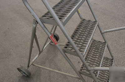 NO RESERVE!!! No Junk Straight Free Wheeling ( Tilt & Go ) Ladder Ind Safety Rolling Ladder features: - - Overall 90-1/2" (top of rail) x 20" wide (32" wide @ bottom wheels) - Top step is 48" high. - Serrated tread. - Manufactured with rigid 1 OD tubing. - Built to OSHA and ANSI standards. - Step size is 7 deep - 5 steps. - Standard finish to powder coat gray. Industry Standard Rolling Warehouse