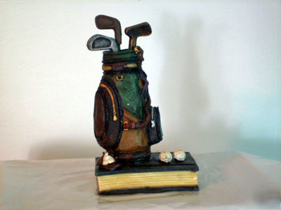 Looking for the perfect gift for your golfing enthusiast? Well here it is: a life-like depiction of the most welcome sight a golf lover can see. It is a 7.5in. tall pewter desk business card holder featuring a golfbag holding three clubs, an old-fashioned golfing hat, and two golf balls all perched atop a book, which is designed to hold your business cards.