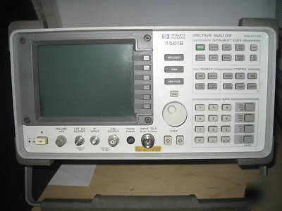 Description: The 8561B RF Spectrum Analyzer is a portable, high performance analyzer with a frequency range of 50 Hz to 6.5 GHz. It features synthesized tuning, built-in frequency counter, digital bandwidths, AM/FM demodulator, and many optional features. Synthesized tuning gives drift-free measurements with resolution bandwidths down to 10 Hz. Measurement sensitivity -130 dBm. Built-in frequency counter. AM and FM demodulators with speaker and volume control. HP-IB.