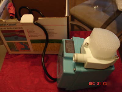 New in box is this Little Giant Compact Submersible Pump 3E/4E series Model #4E-34NR, 115 V, 60 HZ, 3.5 amps, 1 PH. Power rating is 1/12 HP, 10.6 PSI. Cast aluminum housing with protective epoxy coating. Super nylon pumping head and propeller. Viton seal, removable polypropylene screen. Thermally protected, oil filled for lifetime lubrication. UL listed. For use either submerged or in an open air closed-line pipe system in which the fluid is gravity fed to pump intake. This pump measures 7" in length and 5 1/2" high. This pump lists new for $ 180.00 and up.