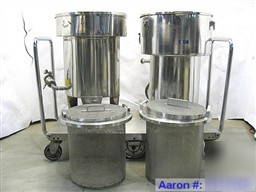 Schubert & Company Capsolut Washers/Rinser, stainless steel. Washer 17" diameter x 20" deep, top opening 21" diameter x 6" deep with cover. Removable basket 13 1/2" diameter x 16 1/4" deep, 1/4" diameter perforations, approximately 3 per inch, 1/2" center bottom outlet with valve, (2) 3/4" diameter NPT, 1/2" diameter NPT. Rinser 15" diameter x 20" deep straight side. Top opening 20" diameter x 11" deep. Removable basket 13 3/4" diameter x 16 1/4 deep 1/8" diameter perforations, approximately 6 per inch. (2) 6 1/2" diameter tri-clamp fittings with plugs, one equipped with 1 1/2" diameter tri-clamp with 1/2" opening, one with 1" diameter NPT, (1) 1 1/2" diameter tri-clamp with 3/4" diameter opening. Mounted on a cart with casters.