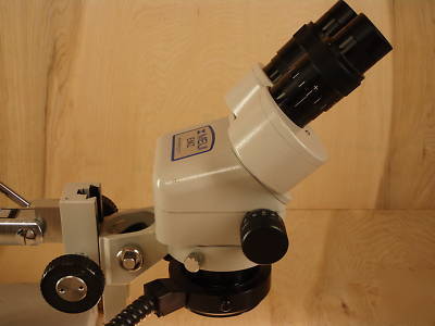 The microscope is mounted on a fully adjustable Boom Stand features rock solid base. Halogen illuminator with Fiberoptic Light transportation system.