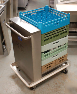 The rack carrier, constructed of all welded 16 ga. stainless steel, is raised by a series of coil springs attached to the frame. Ball bearing guides and a single stainless steel aircraft type cable keep the carrier level in all directions, even with an unbalanced load. The cable runs over pre-lubricated plated steel pulleys.