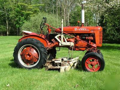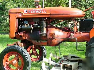 This is a very nice running Farmall A with a Woods Belly mower. FAA-158068. Well cared for and maintained indoors. New battery box and a new cushioned seat. Brakes, transmission and clutch all work well. The Tires are sound without breaks but weathered cracked. There are no lights, but the wiring and switch box is there. The generator charges the battery okay. The engine has good power, good oil pressure, and starts quick in warm and cold weather. Four forward speeds and one reverse. Although not usual it has a temperature gage and adjustable radiator lovers that work. Standard sized PTO shaft.
