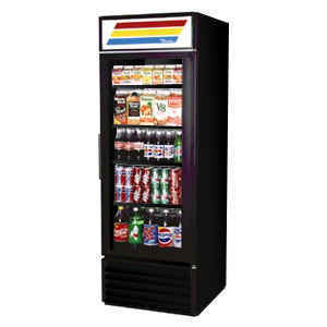 This True GDM-23 23 cubic foot, black, refrigerated, glass door merchandiser has 4 heavy-duty, adjustable, vinyl- coated wire shelves. It has one swinging door that has a positive seal and is self- closing. The door of the True GDM-23 is made of energy efficient, "Low-E", thermal glass and has extruded, aluminum door frames. It uses an oversized (134A) refrigeration system in order to hold temperatures between 33 degrees Fahrenheit and 38 degrees Fahrenheit. The exterior of the True GDM-23 is a durable, permanent, non-peel- or-chip, laminated black vinyl. The interior is NFS- approved, white, vinyl-coated aluminum with a 300-series stainless steel floor and a convenient, clean-out drain. The interior of the True GDM- 23 is lit with safety- shielded, fluorescent lights. This unit has foam-in-place, polyurethane, high-density cell insulation (CFC Free). This True GDM-23 has a bottom- mounted compressor and is a self-contained system that requires no plumbing. The overall dimensions are 27"W x 29 1/2"D x 78 1/4"H. Less than two years old, excellent condition.